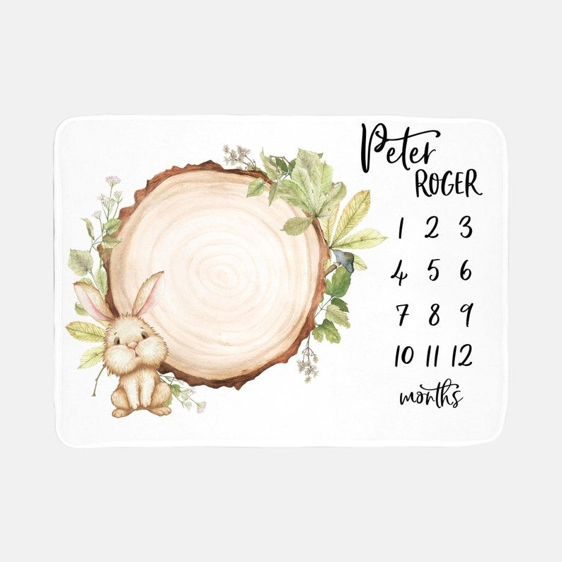 Woodland Bunny Baby Milestones Blanket With Customized Name For Baby Boy Girl Nursery, Son, Grandson, Daughter, Granddaughter