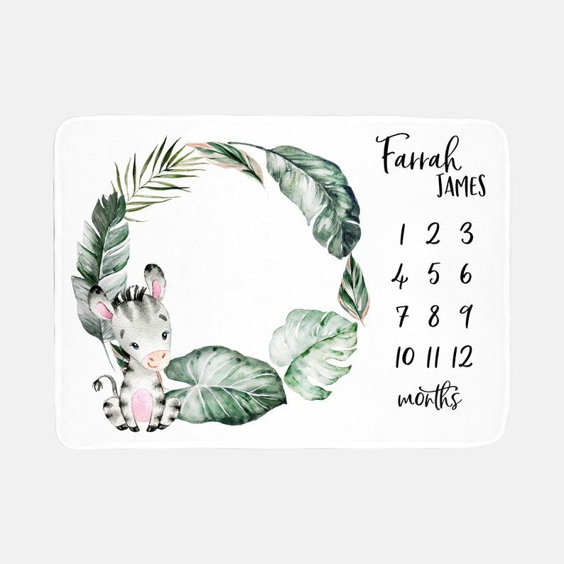 Zebra Baby Milestones Blanket With Customized Name For Baby Girl Nursery, Daughter, Granddaughter